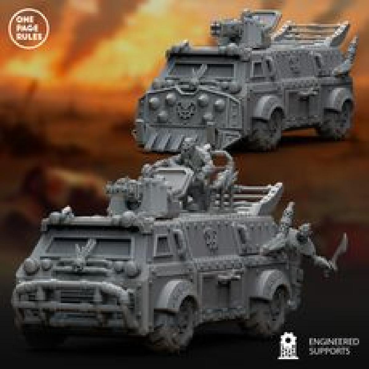foi projetado para Impressora 3D. Obtenha 50% de desconto no Patreon: patreon.com/onepagerules Recursos: - 2 Opcoes de Arma de Torreta (Metralhadora e Lancador de Foguetes)- 2 Opcoes de Casco (Equipe de Rig e Placa Frontal) Informacoes de Tamanho: - Dimensoes (aprox.): A 74mm - L 167mm - P 77mm- Tamanho da Base: n/a Os arquivos estao totalmente pre-suportados!