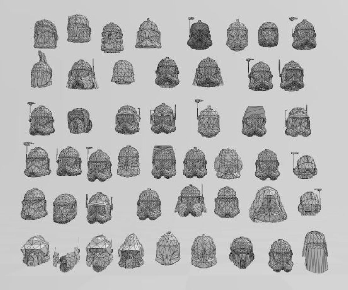 foi projetado para Impressora 3D. Aqui esta minha colecao inacabada de capacetes Low Poly Star Wars de 2013. O que e interessante e que todos eles tem muitas diferencas sutis. Espero que haja algo aqui digno de modificacao. Deixe-me saber se ha um em particular que voce gostaria que pudesse ser impresso e eu tentarei onde puder! Saude JaceNote que o arquivo .3MF e muito mais facil de usar para fins de separacao!Capitao ArcTrooperARF TrooperCapitao BreakerCapitao DevisCapitaoRex Capitao RexOnderon Clone CadeteClone Clone fase 1Clone Fase 2Clone Fase 3Clone Commando Commander BlyCommander CodyCommander Fox CommanderGanch Comander GreeCommander KellerCommander NeyoCommander Thorn Commander TraumaCommander WolffeDogmaDriver TrooperEliteTrooper Galactic MarineGeonosis CloneKasshyyk TrooperNavy TrooperScoutSeargent HoundSenate GuardShadow TooperShock TrooperJet TrooperBlack Ops